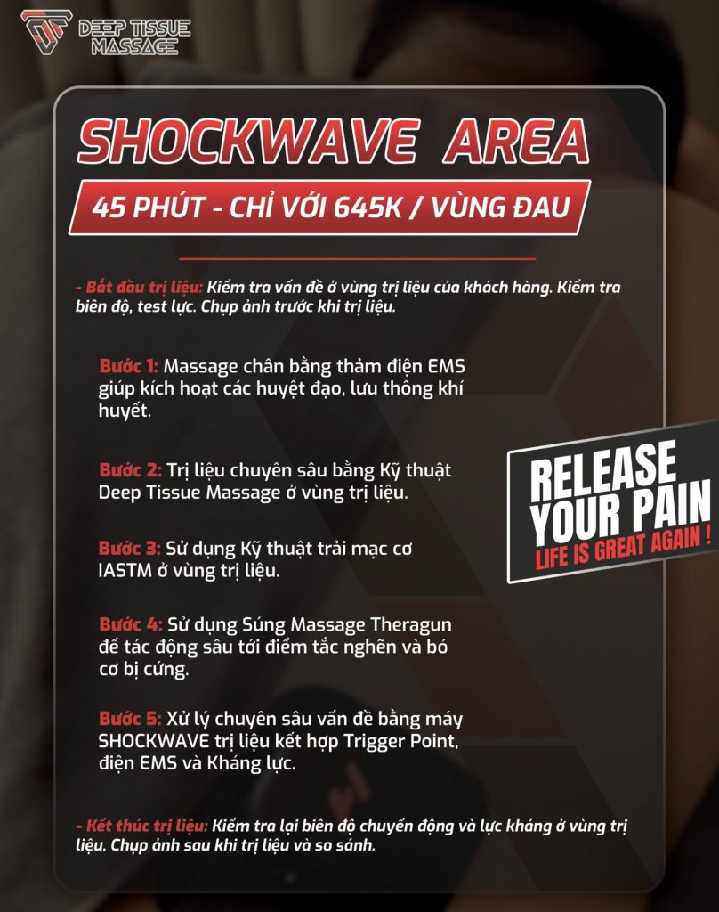 Nếu bạn đang gặp tình trạng đau nhức mãn tính, điểm co cứng lâu năm hoặc chấn thương khó hồi phục, Shockwave Area là liệu trình trị liệu chuyên sâu, sử dụng sóng xung kích hiện đại kết hợp các kỹ thuật trị liệu hiệu quả để nhanh chóng giảm đau và khôi phục chức năng vận động.